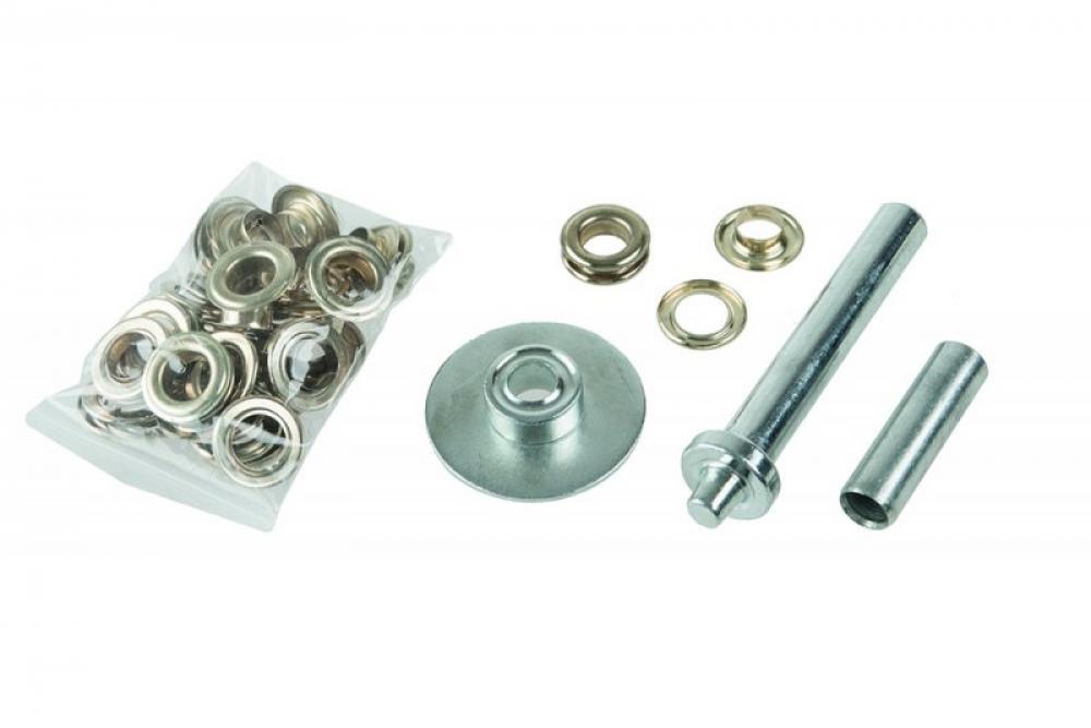 aplikační sada na oka do plachet sada obsahuje aplikátor, 25 párů ok, výsečník otvorů pro oka postup aplikace zobrazen na obrázku