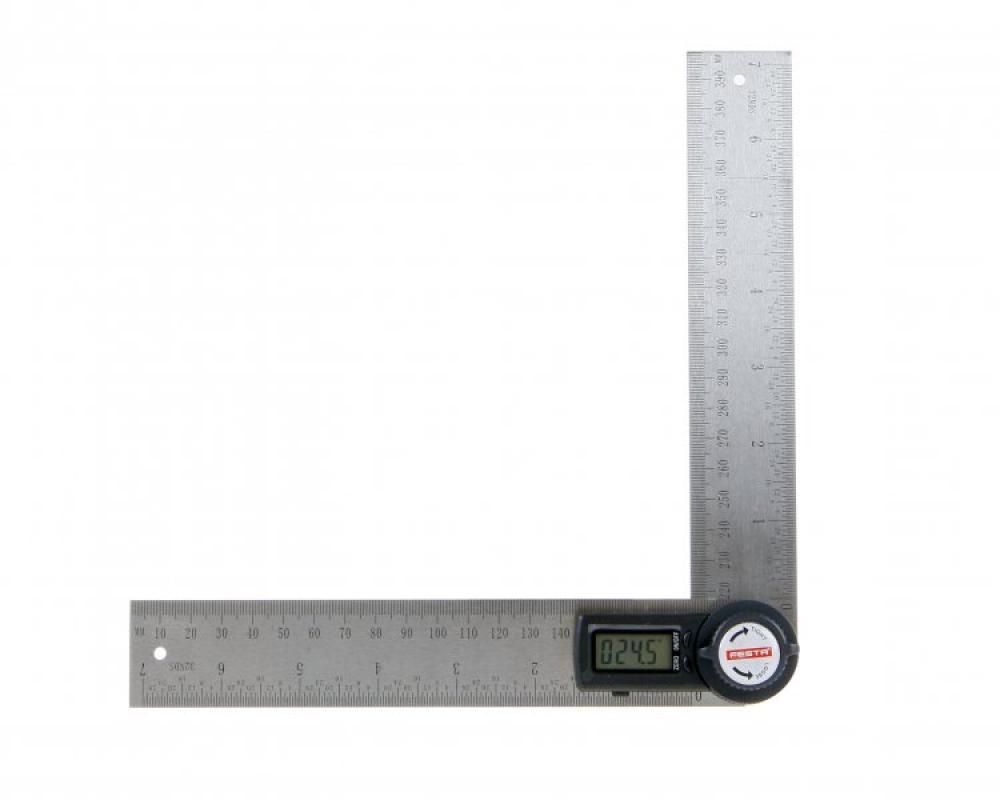 Digitální úhloměr pro měření vnitřích i vnějších úhlů. Vybaven zajišťovacím šroubem pro přidržení určitého úhlu. Měřícího rozsahu ± 360 °. Přesnost ± 0,3 °. Pracovní teplota 0-50°C. Automatické vypnutí. Nastavení nuly v libovolné poloze. Stupnice pravítka 1 mm a 1/32 palce. Průřez pravítka 35 x 2,5 mm. Dva montážní otvory. Aretace šroubek. Napájení 1 baterie typu CR2032 3V.