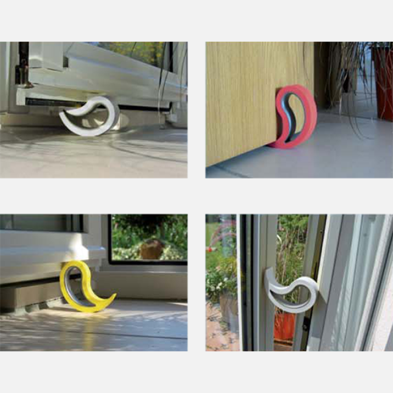 Jedinečná zarážka pro zabezpečení oken a dveří před průvanem. Zarážka je konstruována tak, aby pevně zafixovala okenní či dveřní křídlo, bez ohledu na profilování rámu či křídla. Zákazník si může vybrat ze široké palety barev a sladit tak odstín dveří, dlažby, okna či žaluzií.