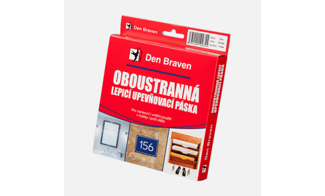 Pro mnohostranné upevňovací práce v hobby sféře. Ideální pro upevňování výstražných a informativních cedulí a dekorativních předmětů. Okamžité upevňování firemních tabulí na prezentacích, výstavách a veletrzích. Fixace lepených předmětů při montážích jako lepení zrcadlových stěn, menších zrcadel do skříní a koupelen apod. Vysokou lepivost a přilnavost k podkladu obstarává speciální oboustranný nános kaučukového lepidla na pěnové PE pásce. Pevnost v tahu (únosnost): 100 N/cm2, pevnost ve střihu: 41 N/cm2, přilnavost k podkladu: 27 N / 25 mm. Tepelná odolnost pásky -40°C až +70°C. Aplikovat pásku je možné v rozsahu +10°C až +40°C. Detailní informace k výrobku, postupy, hodnoty atd. jsou uvedeny v technickém listu na www.denbraven.cz.