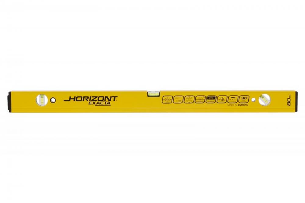 Horizont EXACTA 3 libely, PŘESNOST 0,3MM/M = 0,017° (V ZÁKLADNÍ POLOZE), zesílený ALU profil 2,2mm, frézovaná základna, kapalina v libelách UV stabilizovaná a fluorescenční, otická horizontální libela - snadné a přesnější měření, dvojité kroužky v libele umožňují nastavit sklon 2%, vodováha je odolná proti provozním nárazům, KAŽDÝ KUS ELEKTRONICKY TESTOVÁN.