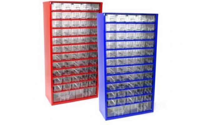 rozměry (Š x V): 30,5 x 58 cm zásuvky: 55 malých, 2 střední materiál: kov, plast barva: červená, modrá Kovová ukládací skříňka s plastovými zásuvkami 2 velikostí je vhodná pro přehledné skladování drobných předmětů a součástek.