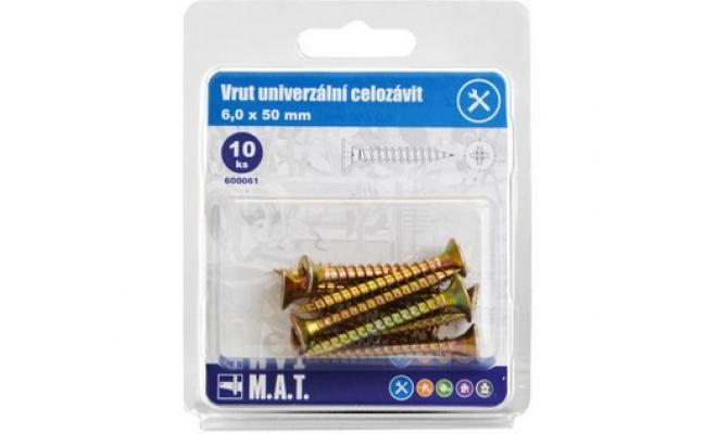 rozměry (pr. x D)): 6,0 x 50 mm materiál: Zn celozávit 10 ks Univerzální vrut je spojovací součástka s vnějším závitem, určená k vytváření rozebíratelných spojů především měkkých materiálů (dřevo, plast, sádrokarton).