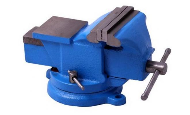 Otočný dílenský svěrák s čelistmi pro upnutí trubek.
