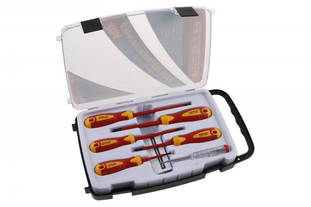 sada 5 ks elektrošroubováků FESTA se zkoušečkou v plastovém kufříku šroubováky mají certifikaci elektro VDE 1000 V, IEC/EN 60900-2004 kovový dřík je vyroben z velmi kvalitní CrV oceli, kalený...