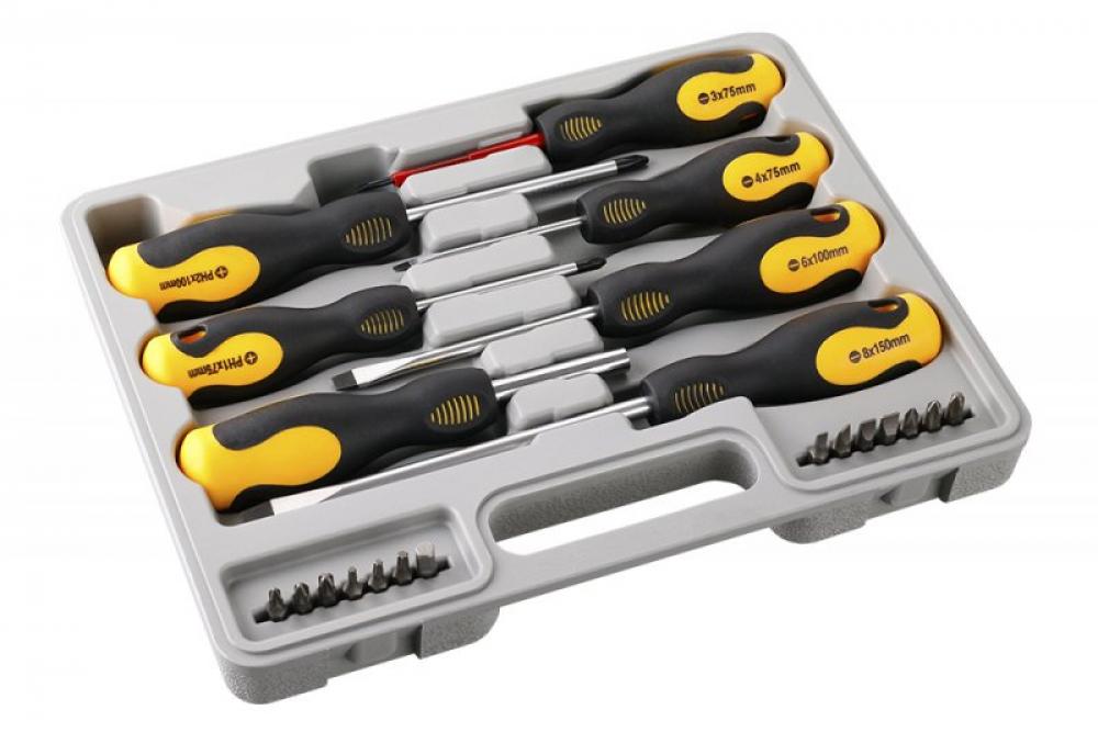sada šroubováků a bitů 1/4" * 25 mm, CrV magnetické koncovky, ergonomická neklouzavá rukojeť obsah sady 21 kusů : 4x plochý šroubovák 4*75, 6*100, 8*150 a elektro 3*75 2x křížový šroubovák PH 1*75, 2*100 1x šroubovák na bity, 14x bit ploché 4, 5, 6, 7 - PH 1, 2, 3 - PZ 1, 2, 3 - Torx T 15, 20, 25 a adapter šestihran 1/4" / čtyřhran 1/4" plastové pouzdro