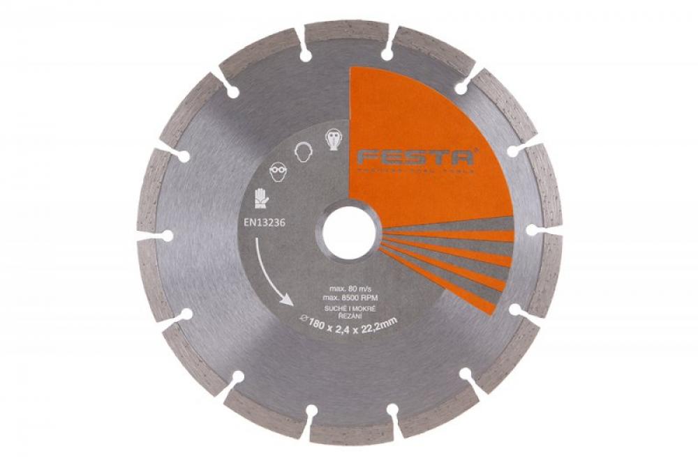 Profesionální diamantový kotouč FESTA, provedení : SEGMENTOVÝ, kvalitní materiály i zpracování - vysoce pevné uchycení diamantových segmentů k nosnému disku kotouče, vysoký obsah diamantového prachu...