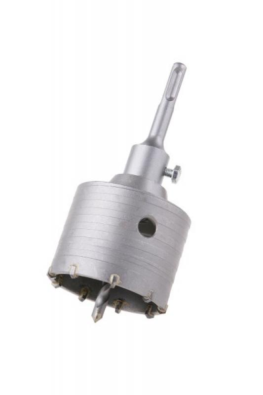 vykružovací / vrtací korunka s SK plátky a vodícím vrtákem uchycení SDS+ kvalitní SK plátky (SK - slinutý karbid), dlouhá životnost, rychlý prostup materiálem vodící - středící vrták usnadňuje práci a korunku přesně vede a drží na požadovaném místě pro vrtání větších průměrů do betonu, porobetonu, cihel a podobných zdících materiálů korunka není vhodná na vrtání železobetonu