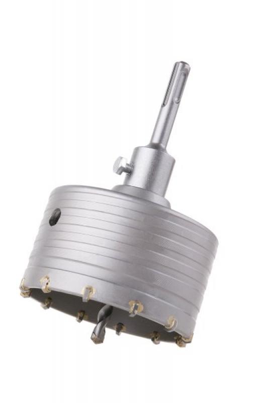 vykružovací / vrtací korunka s SK plátky a vodícím vrtákem uchycení SDS+ kvalitní SK plátky (SK - slinutý karbid), dlouhá životnost, rychlý prostup materiálem vodící - středící vrták usnadňuje práci a korunku přesně vede a drží na požadovaném místě pro vrtání větších průměrů do betonu, porobetonu, cihel a podobných zdících materiálů korunka není vhodná na vrtání železobetonu