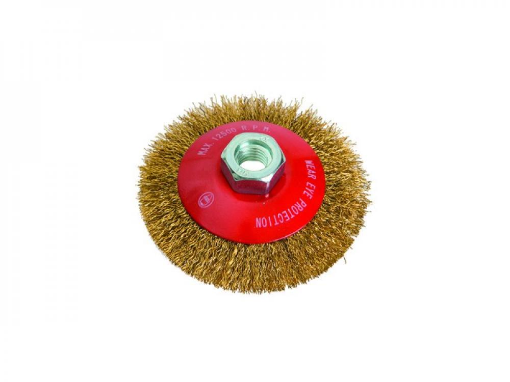 Kartáč miskový s mosaznými vlnitými drátky, uchycení M14, miskový, vhodné pro nerezové materiály.