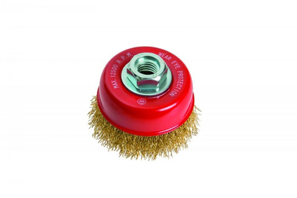 Kartáč miskový s mosaznými vlnitými drátky, uchycení M14, hrnkový, vhodné pro nerezové materiály.