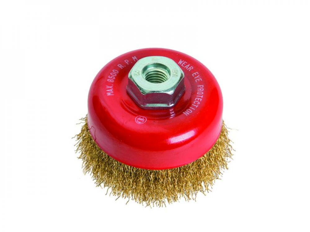 Kartáč miskový s mosaznými vlnitými drátky, uchycení M14, hrnkový, vhodné pro nerezové materiály.