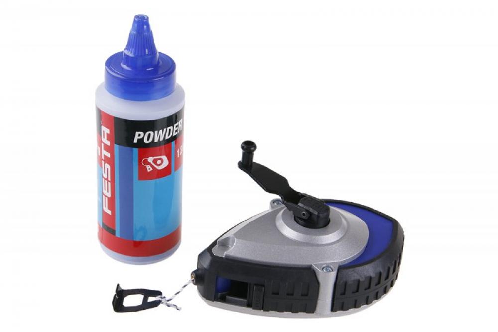 Sada navíječ a pudr FESTA, pouzdro navíječe z hlikové slitiny chráněno gumovou pryží, převodové navíjení - vyšší rychlost navíjení provázku při běžném otáčení klikou navíječe, délka provazu - 30 m, hmotnost pudru 120 g, použití: označení přechodů - linií ve stavebniství ,malířství, SDK,..., po naplnění přiloženým pudrem ( modrý - lze doobjednat : modrý 37096, světle-modrý 37094, červený 37097, světle-červený 37095, černý 37098), postup: přiloženým pudrem naplníme navíječ, protřepáním a opakovaným vysunutím a opětovným navinutím provazku jej probarvíme, po-té ve dvou napneme provázek v potřebném místě vyznačení linie a lehce brnkneme - tím se pudr zachycený na provázku nanese v tenké vrtstvě na značený materiál, pak provázek navineme, popř. opět doplníme pudrem, balení: blistr s eurootvorem.