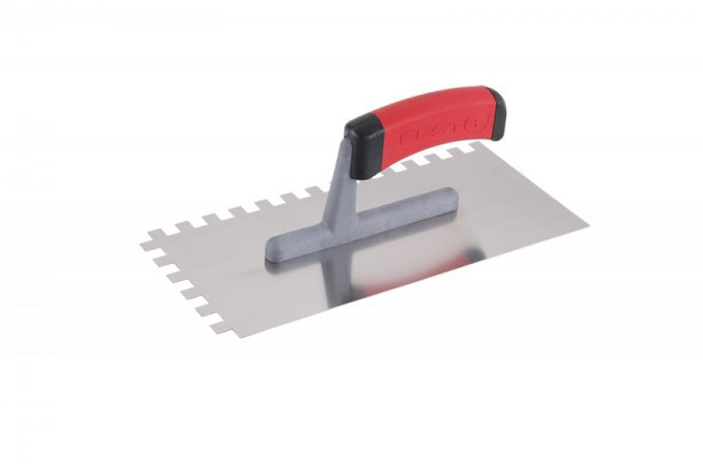 Hladítko nerezové zubové FESTA 280x130 mm, zub e10, s gumovou ručkou, tl.plechu 0,8mm. Používá se zejména k nanášení lepidel pod obklady a dlažby, dále pak k nanášení stěrek, štuků, omítek, tmelů a...