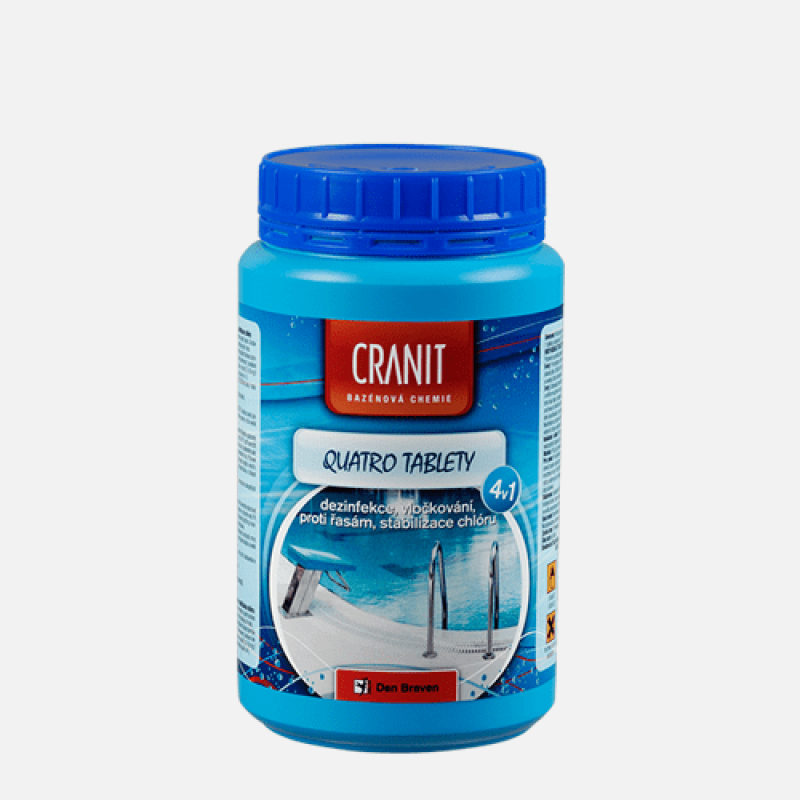 Návod k použití: Před prvním použitím přípravku vždy upravte hodnotu pH na 6,8 – 7,6, proveďte počáteční šokovou dezinfekci vody rychlorozpustným chlorovým přípravkem Cranit chlor šok. Tablety dávkujte sběračem (skimmerem), plovákem nebo jiným dávkovačem při zapnutém filtračním zařízení. Je nutné udržovat obsah aktivního chlóru v rozmezí 0,3 – 0,8 mg/l a pH 6,8 – 7,6. Obsah chlóru a hodnotu pH kontrolujte 1x týdně pomocí testerů (Cranit tester pro bazény 4v1).
