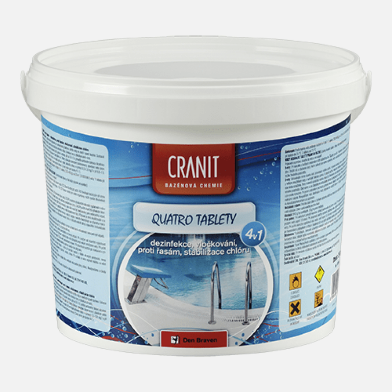 Návod k použití: Před prvním použitím přípravku vždy upravte hodnotu pH na 6,8 – 7,6, proveďte počáteční šokovou dezinfekci vody rychlorozpustným chlorovým přípravkem Cranit chlor šok. Tablety dávkujte sběračem (skimmerem), plovákem nebo jiným dávkovačem při zapnutém filtračním zařízení. Je nutné udržovat obsah aktivního chlóru v rozmezí 0,3 – 0,8 mg/l a pH 6,8 – 7,6. Obsah chlóru a hodnotu pH kontrolujte 1x týdně pomocí testerů (Cranit tester pro bazény 4v1).