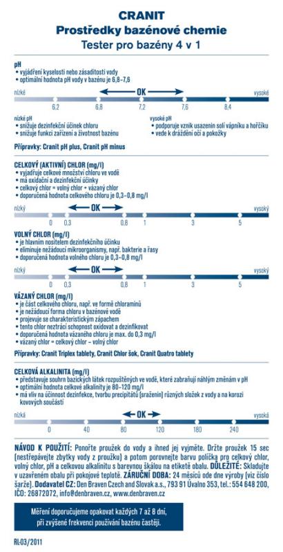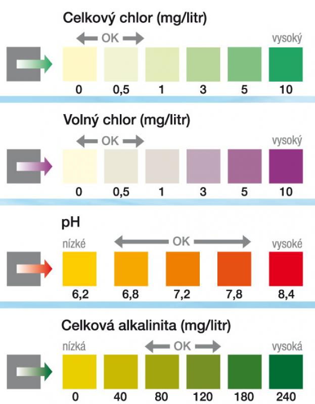 Návod k použití: Ponořte proužek do vody a ihned jej vyjměte. Držte proužek 15 vteřin (nesetřepávejte zbytky vody z proužku) a potom porovnejte barvu políčka pro celkový chlór, volný chlór, pH a celkovou alkalinitu s barevnou škálou na etiketě obalu.