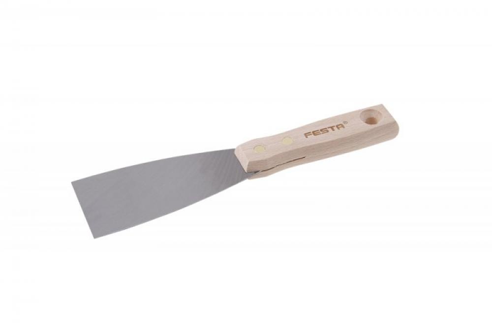 Malířská stěrka (špachtle) s broušeným ocelovým břitem a s dřevěnou nýtovanou rukojetí. Malířské stěrky se použivají pro zapravování děr, zeškrabavání přebytečného materiálu apod. Šířka břitu: 60mm