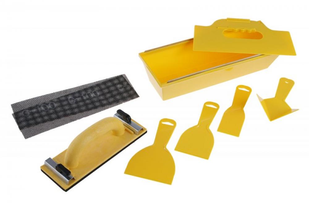 Sada pro sádrokartonáře 9 -dílná, složení : vanička, čtyři druhy špachtlí, 1 rohová, držák na brusnou mřížku, 2ks brusné mřížky zrnitost 100. Sada je určena na tmelení a broušení sádrokartonu.