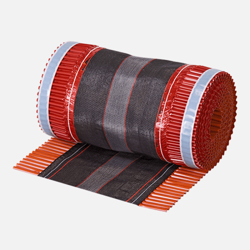 Jednovrstvý ventilační pás hřebene a nároží šikmých střech. Zhotoven z profilovaného hliníkového plechu, PP textilie a samolepicí syntetické pásky. Spoj hliníkového plechu a PP textilie je zpevněn sešitím, což znásobuje odolnost a trvanlivost materiálu. Současně obsahuje speciální přísady, které zvyšují odolnost proti UV záření až na 3 měsíce, a životnost produktu je garantována po dobu min. 10 let.