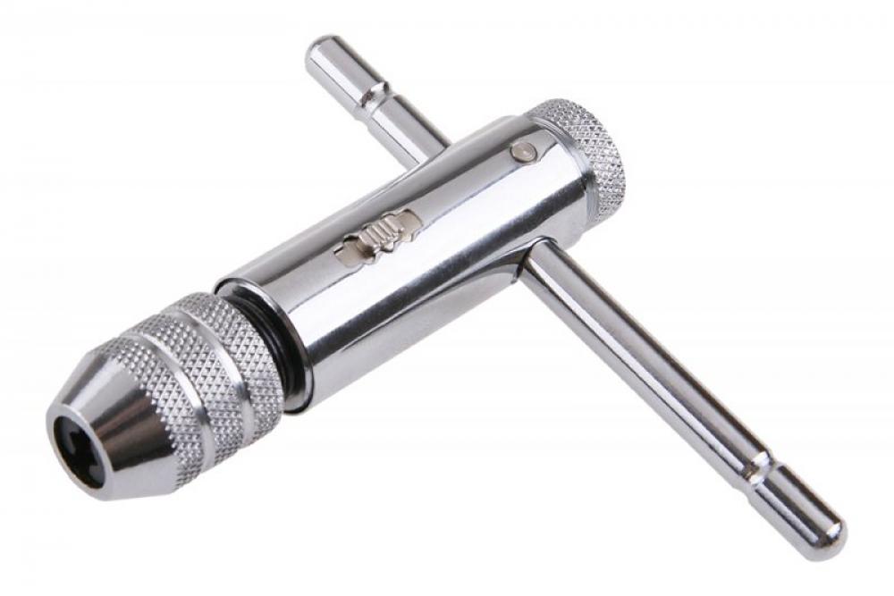 Ráčnové vratidlo pro práci se závitníky, použití: k uchycení závitníků, M3 - M8, ráčnový mechanismus i tvar pomahá při řezání závitu na méně přístupných místech, nastavení směru otáčení (pravý, levý,...