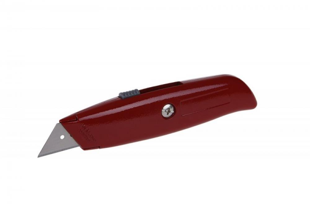 Kovový nůž s výsuvnou lichoběžníkovou čepelí, čepel uchycena uvnitř těla nože na posuvném jezdci.