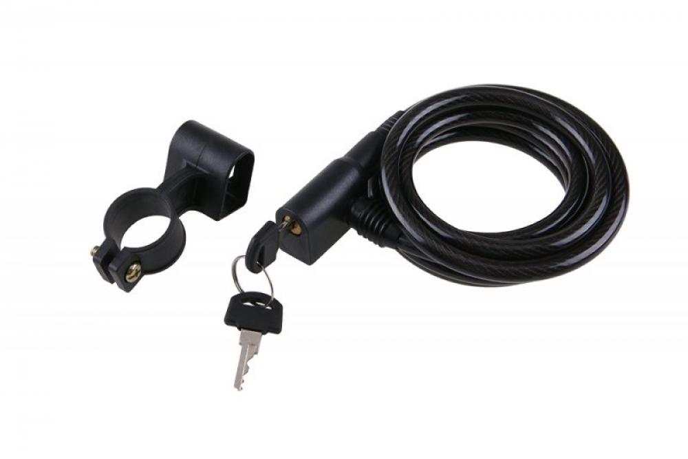 180 cm spirálové lanko z kvalitní oceli Ochranný plášt z PVC Průměr: 8mm Klíče: 2 Váha: 228g Plastový držák na kolo.
