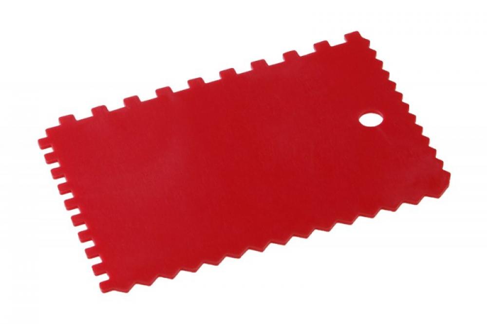 Stěrka plastová, rozměr : 150 x 80 mm, použití :různé druhy a tvary zubů na jedné stěrce - slouží k roztírání lepidel.
